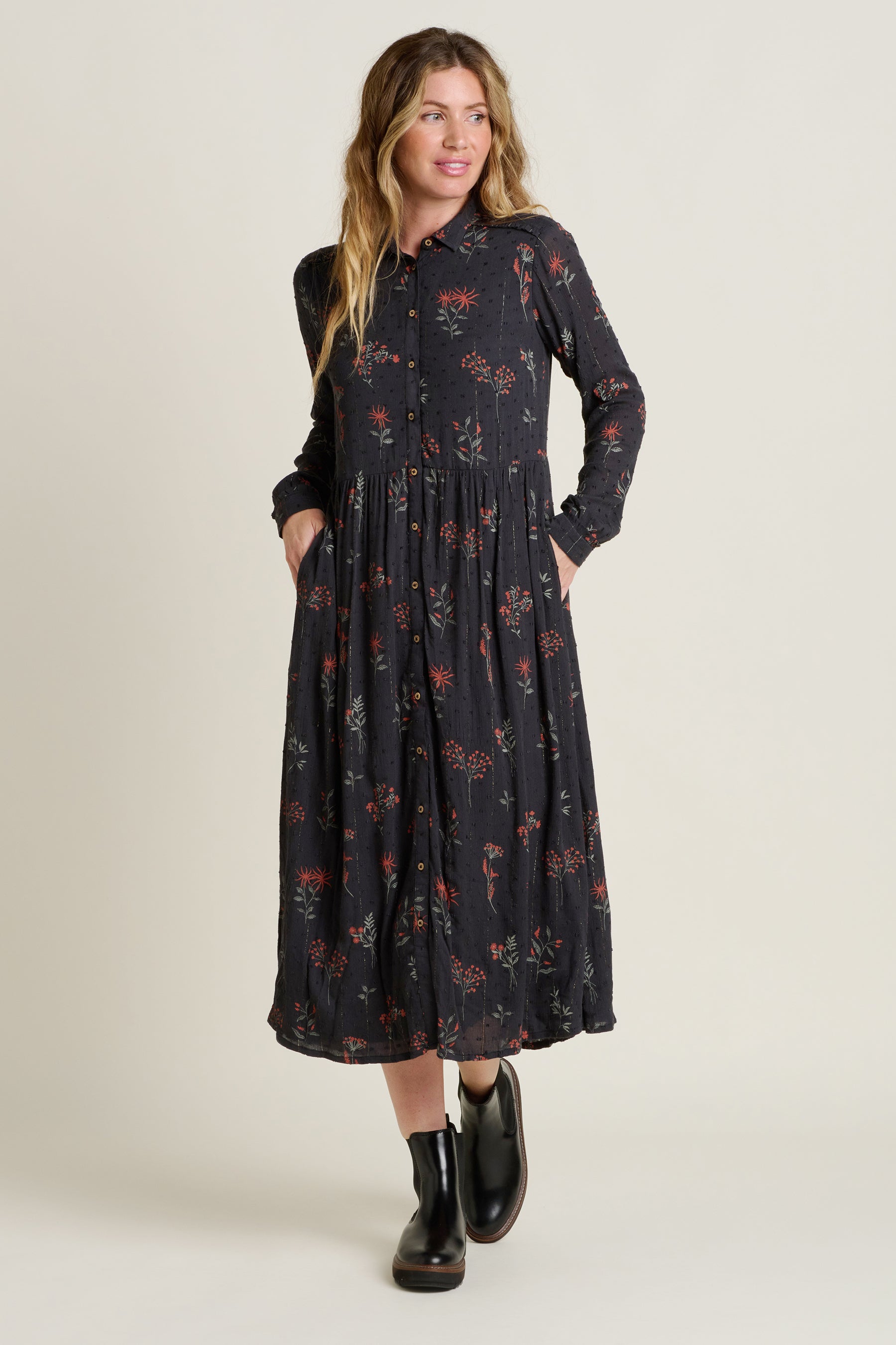 We can’t resist the moody blooms of the Bella Maxi Shirt Dress. It’s lightweight and floaty with a slight gathering at the waist to add definition. It has a subtle metallic thread woven in that glistens in the light too. The Bella Maxi Shirt Dress has pockets, full length sleeves and playful ruffles at the neck, cuffs and across the back. Wear with boots or with a denim shirt for brunch out with friends.